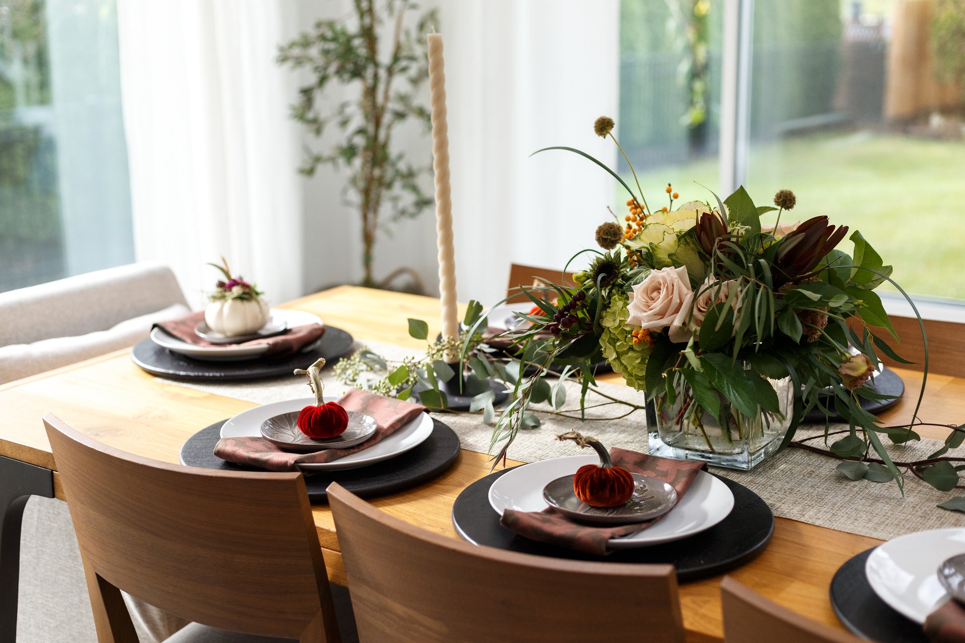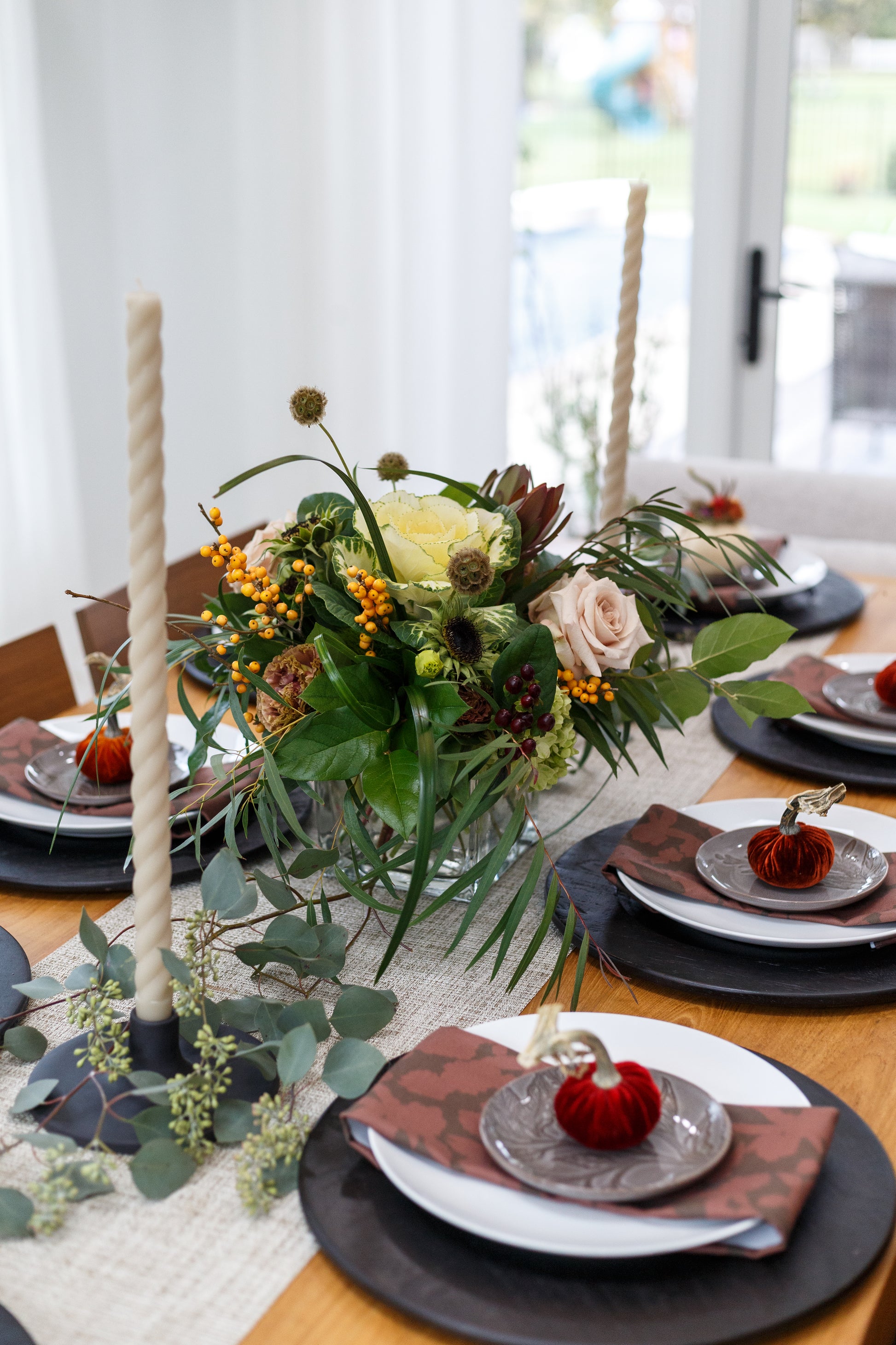 A fresh, contemporary take on Thanksgiving florals, airy design, natural movement, and deeper color pairings.